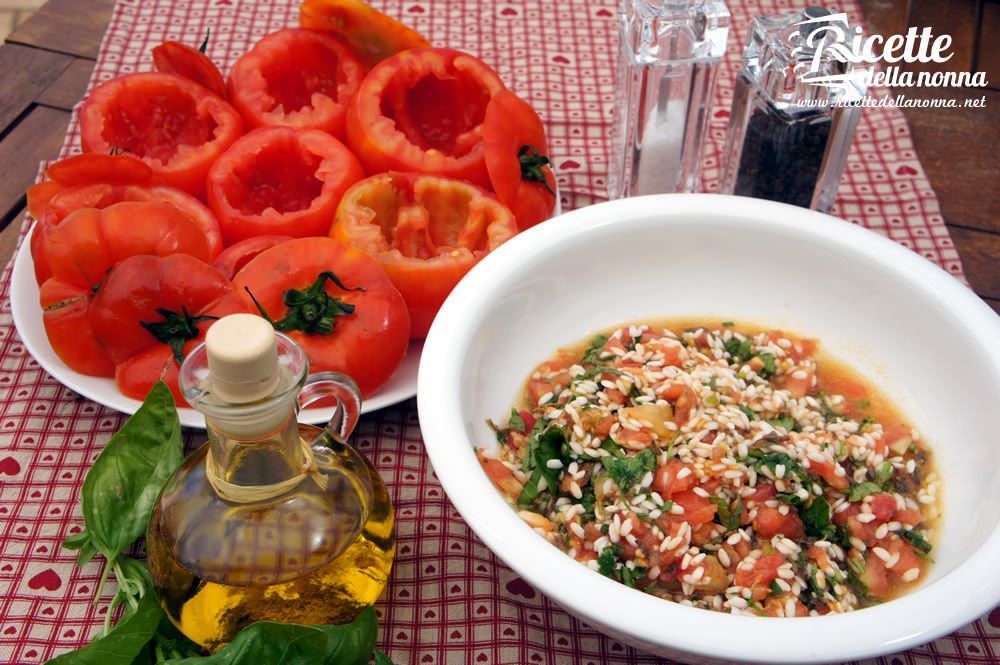 Riempite i pomodori con il riso e chiudete con la parte superiore del pomodoro che avevate precedentemente tagliato.